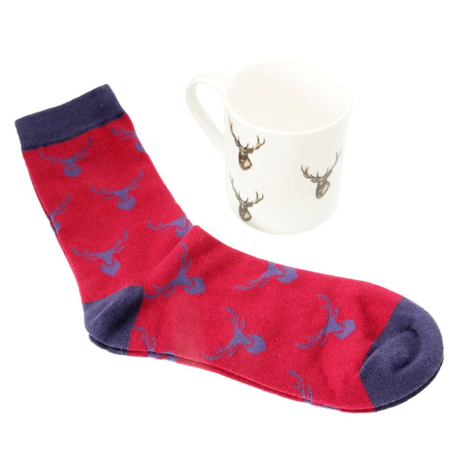 Hand illustrated Stag Fine Bone China Mug with matching socks! An ideal and practical gift set for the country gent or keen huntsman.